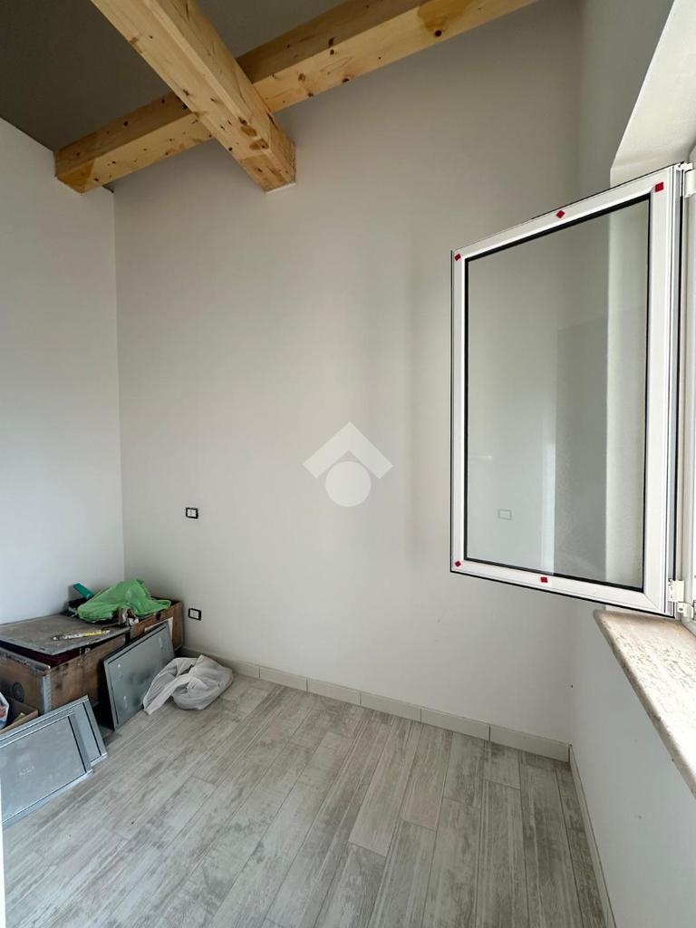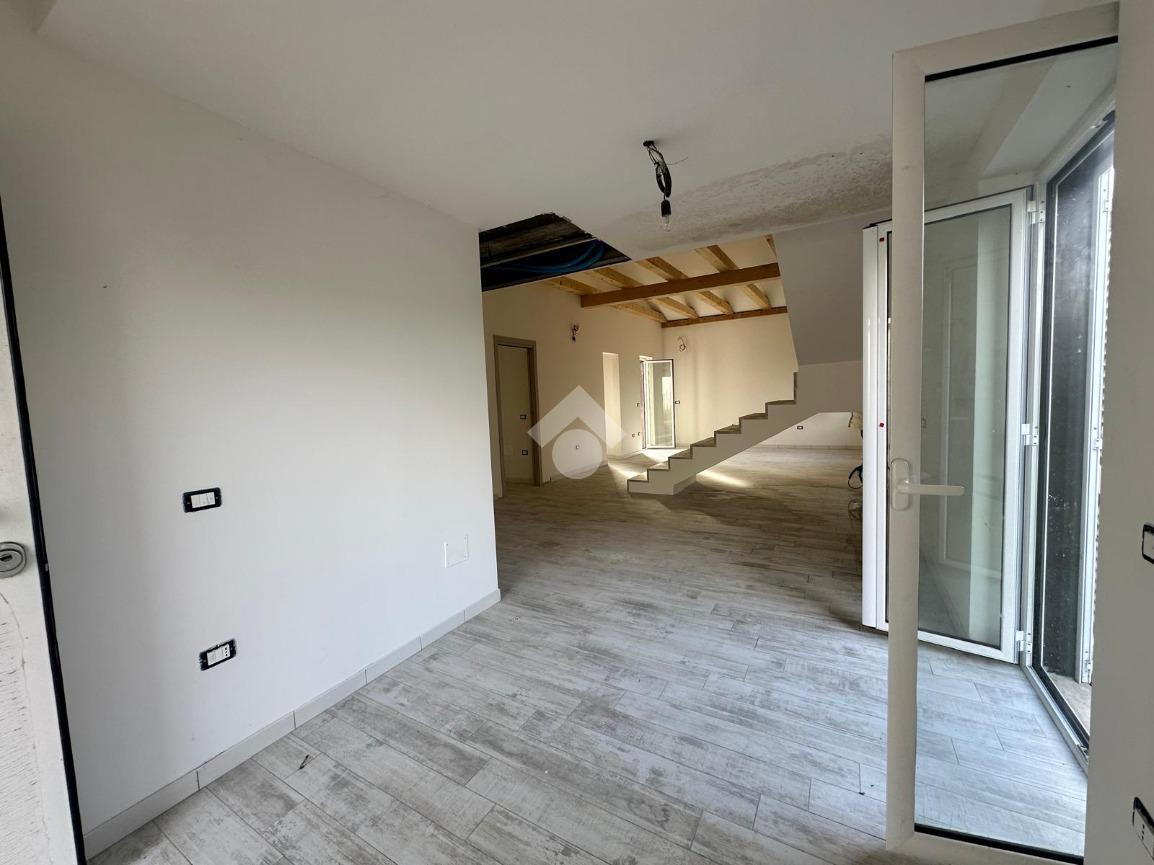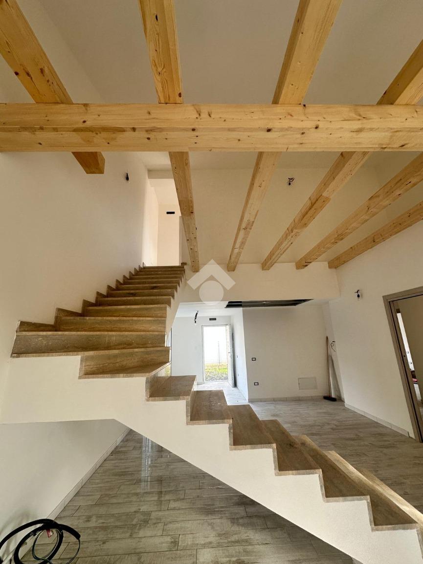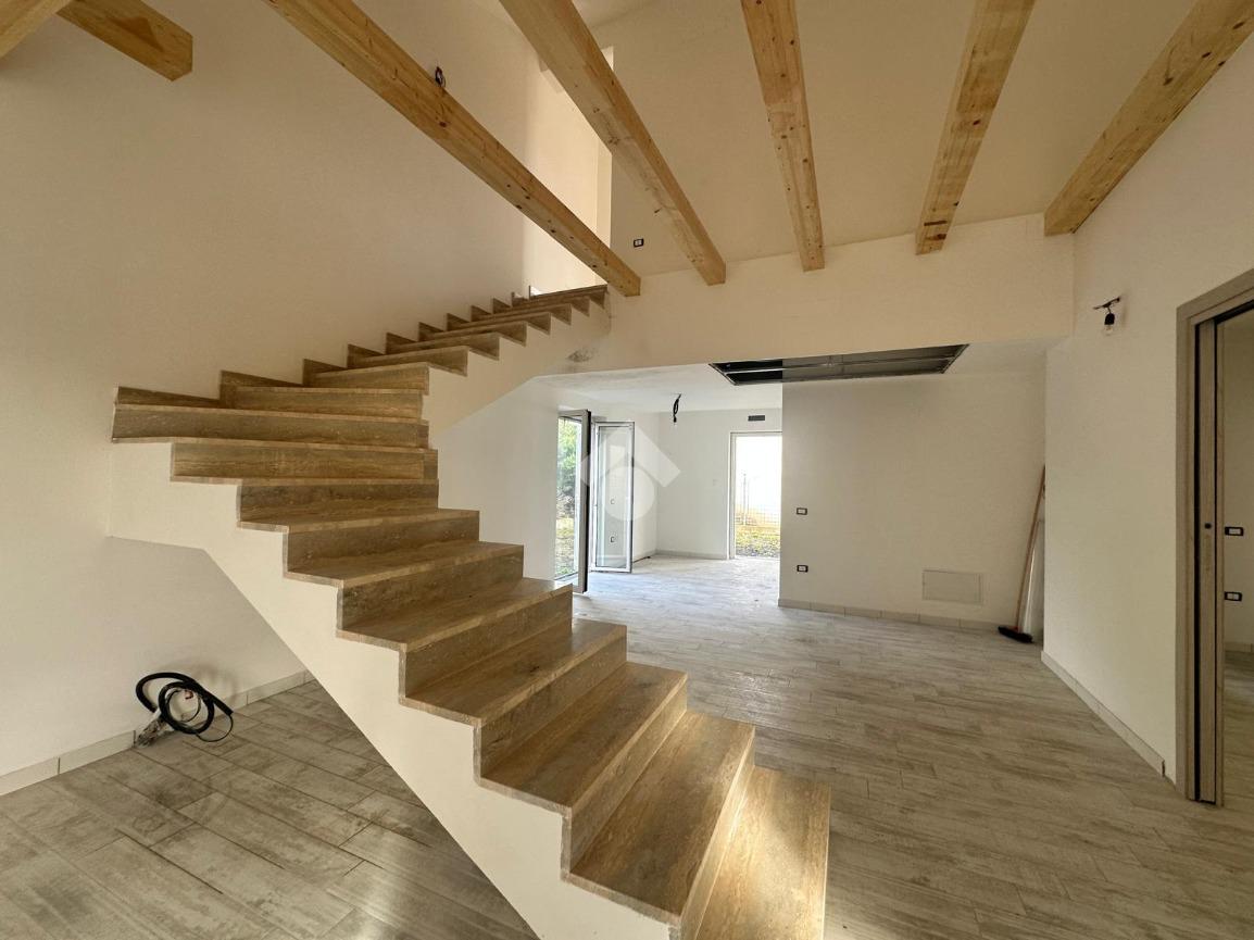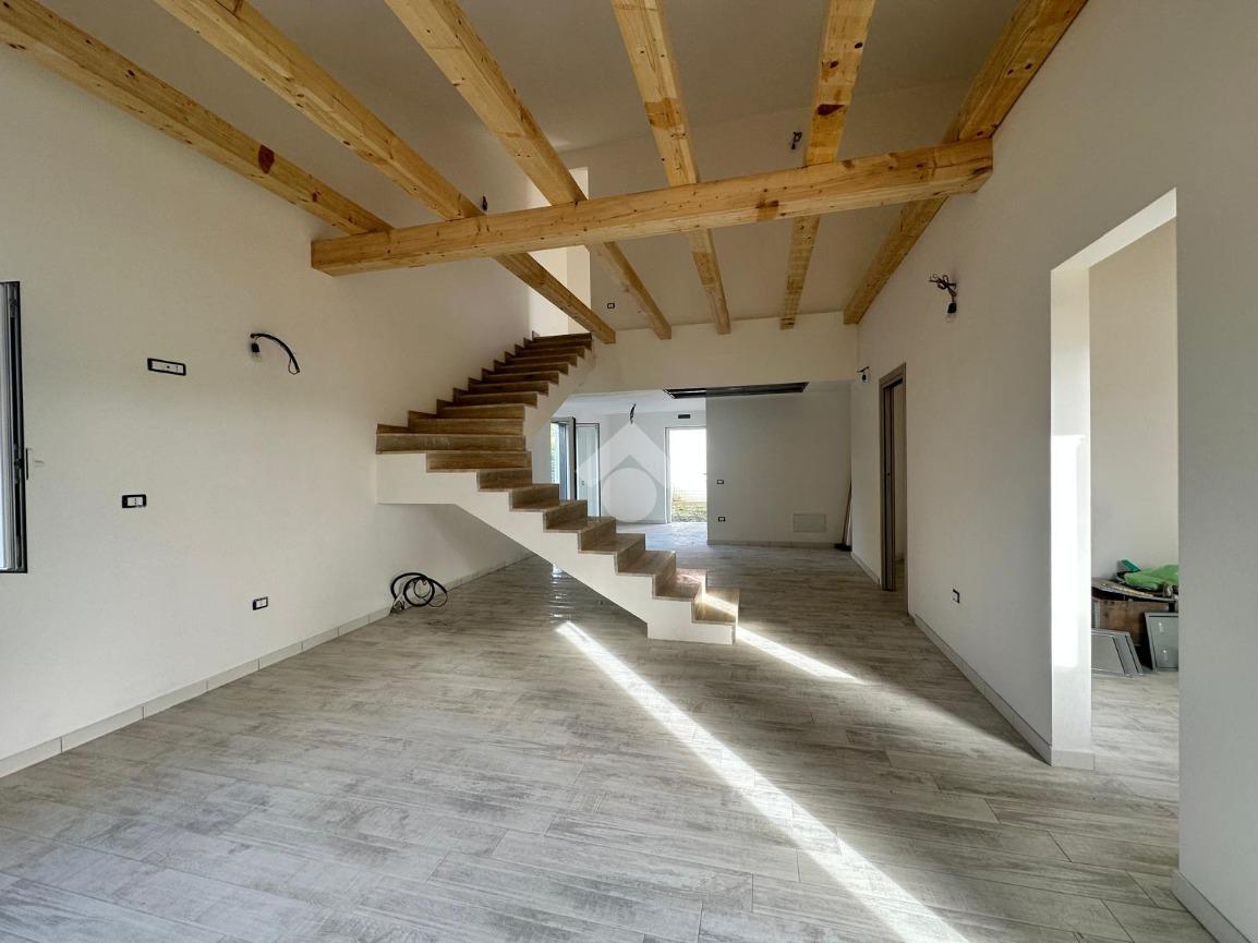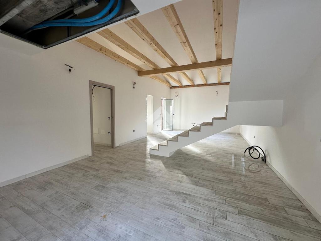 L'ingresso accoglie con un ampio soggiorno e una cucina, caratterizzati da una scala a vista e travi in legno che donano un tocco di calore e accoglienza.